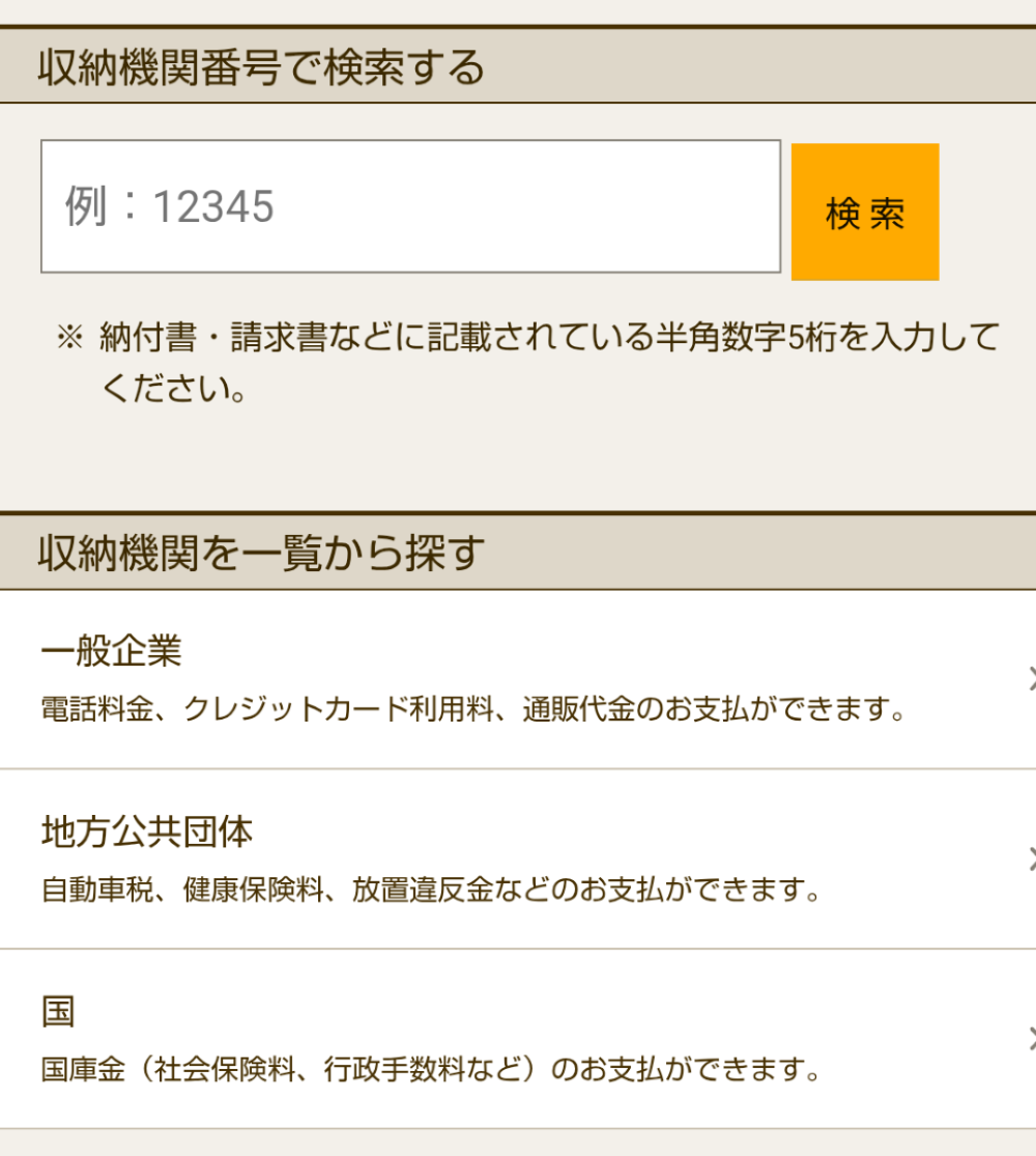 ペイジーの支払いページでは、収納機関を収納機関番号で検索するか、収納機関を一覧から探します(画像は楽天銀行アプリのものです)。